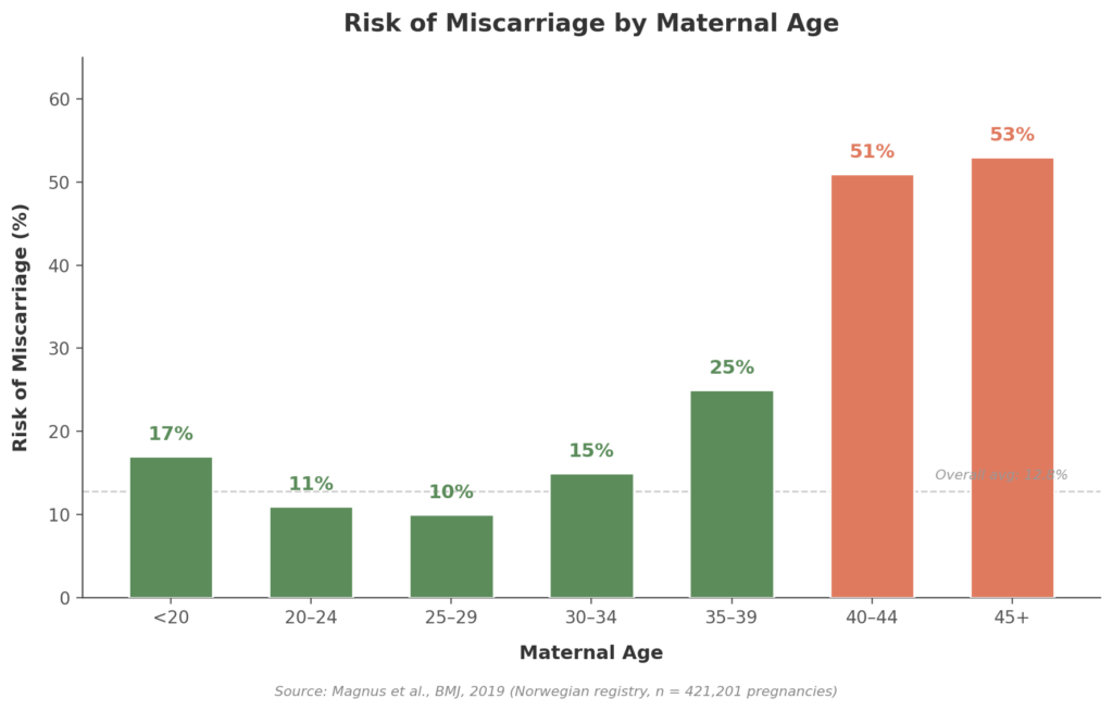 I also see a lot of denial in these patients. Your brain tells you, “You don’t have infertility. You got pregnant before.” And so you wait, month after month, pushing off the call to a specialist. I understand that instinct. but especially if age could be a factor, that waiting can have real consequences. The data on miscarriage risk alone makes the case for acting sooner rather than later: